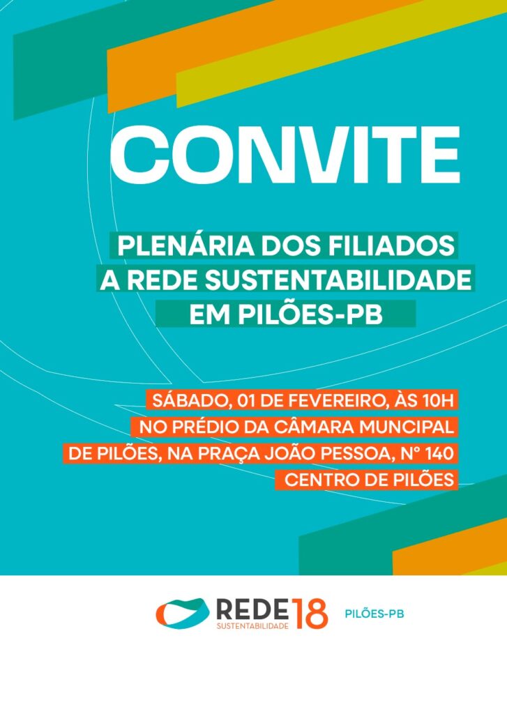 A direção municipal da Rede Sustentabilidade no município de Pilões convoca os filiados devidamente habilitados ao exercício de voto para comparecerem a Plenária Rede, que irá acontecer no dia 1º de fevereiro, às 10h no prédio da Prefeitura Municipal de Pilões, localizado na Praça João Pessoa, número 140, Centro.